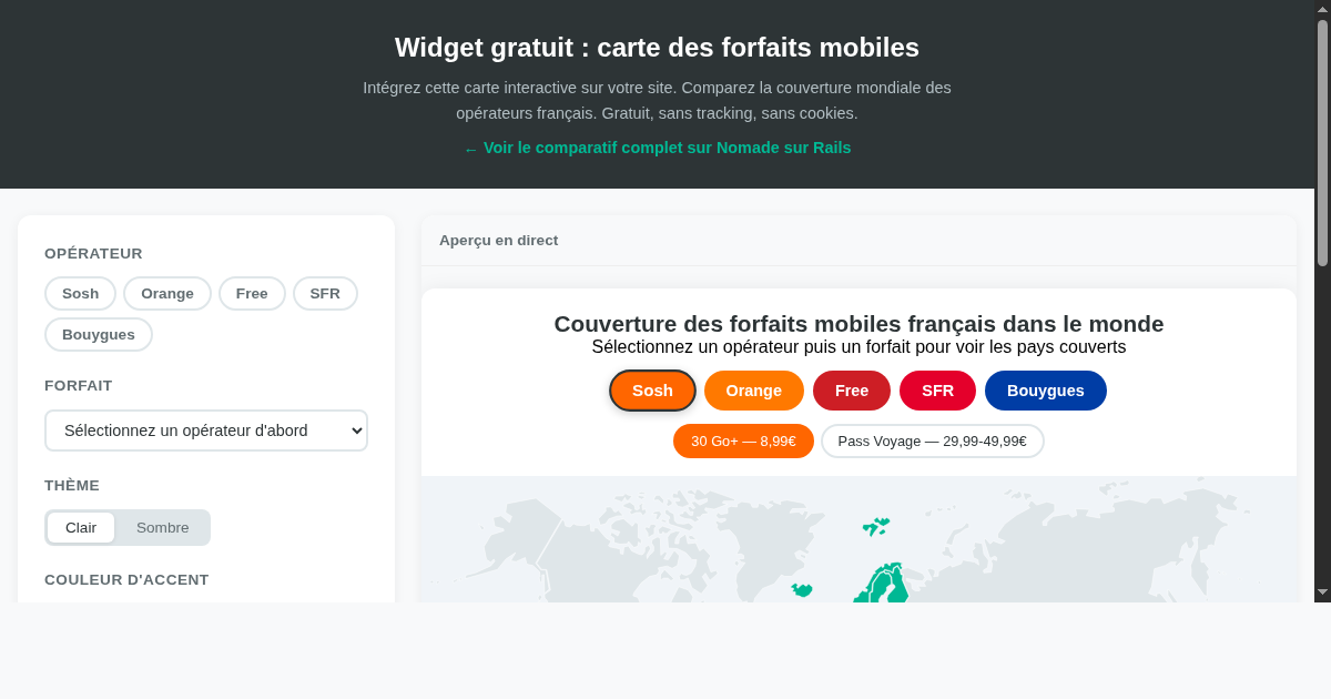 Retour technique sur la création d'un widget embarquable pour comparer la couverture mondiale des forfaits mobiles français. HTML/CSS/JS pur, carte SVG, et configurateur self-service.